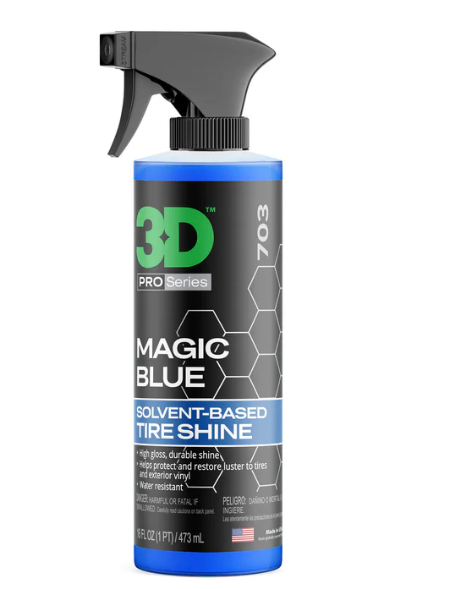 3D Magic Blue Dressing was designed as a “catch-all” dressing to use on pretty much every solid surface of your vehicle. 3D Magic Blue Dressing can be used effectively on any trim, vinyl, molding, bumper, or tires on your vehicle. The high viscosity of 3D Magic Blue Dressing will ensure that it does not run down the surface while you are trying to apply it in the more minute and niche areas of your car. 3D Magic Blue Dressing is water resistant, so it will aid in preventing water spots from forming on your vehicle. The long-lasting glossy finish will have you truly believing just how Magical this product is!