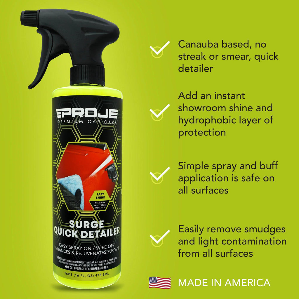 Proje’s Suge Quick Detailer is the perfect detail spray for maintaining your car's deep rich shine. Specifically formulated to quickly and easily lift and remove fresh contamination like fingerprints, streaks, light dust, and more. Perfect for maintaining your car's finish in between washes. Safe and effective on all surfaces like paint, glass, wheels, and trim.