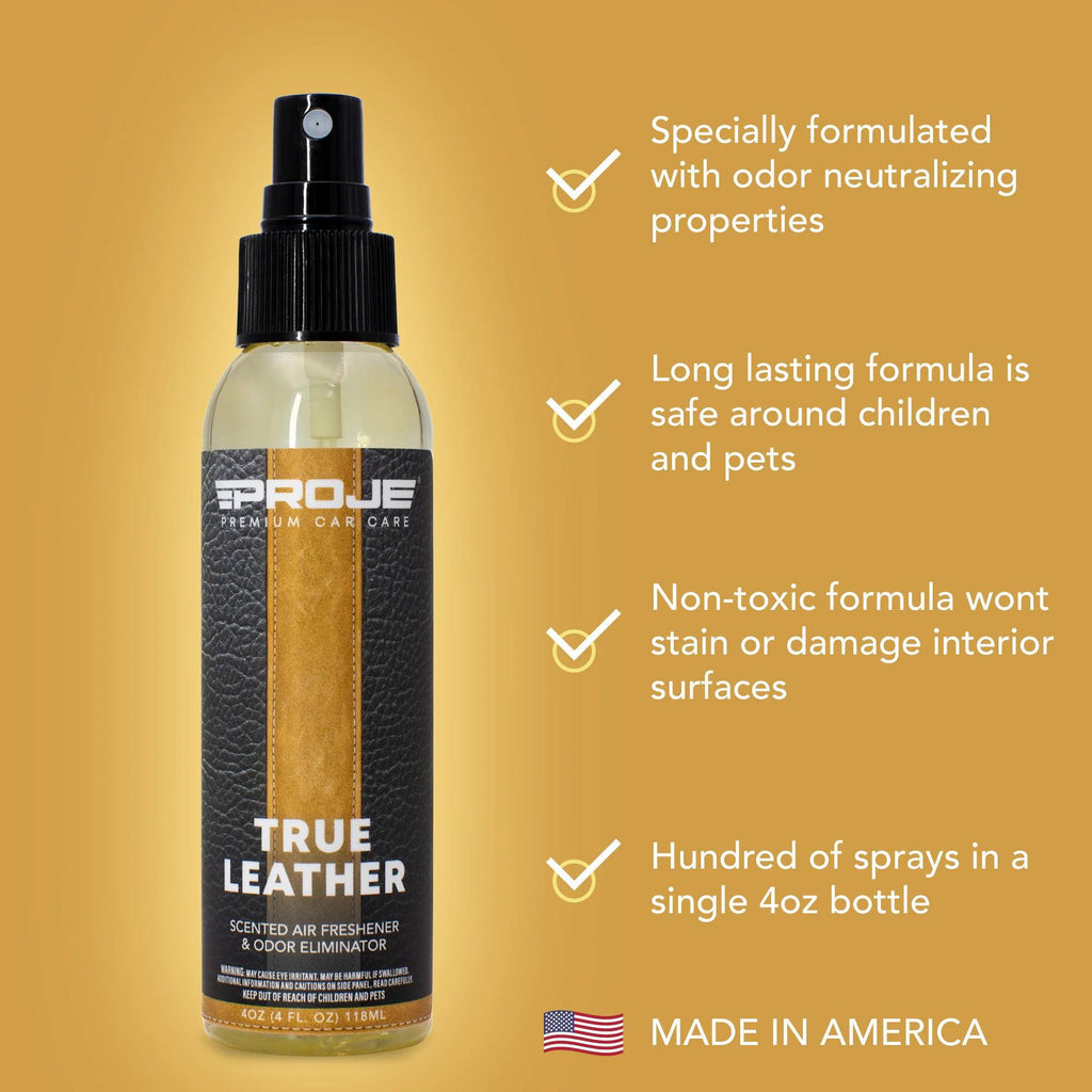 Proje’s True Leather scent is a non-toxic mist that can be sprayed around the whole vehicle without worrying about damaging or staining any surfaces. Our True Leather car fragrance is made with advanced odor eliminating ingredients that work against unpleasant odors, eliminating them and replacing them with a refreshing smell of sandalwood and citrus! The sprayable True Leather air freshener for cars is perfect for adding a luxury aroma to your vehicle. Spray directly onto your carpets and fabrics for long lasting results.